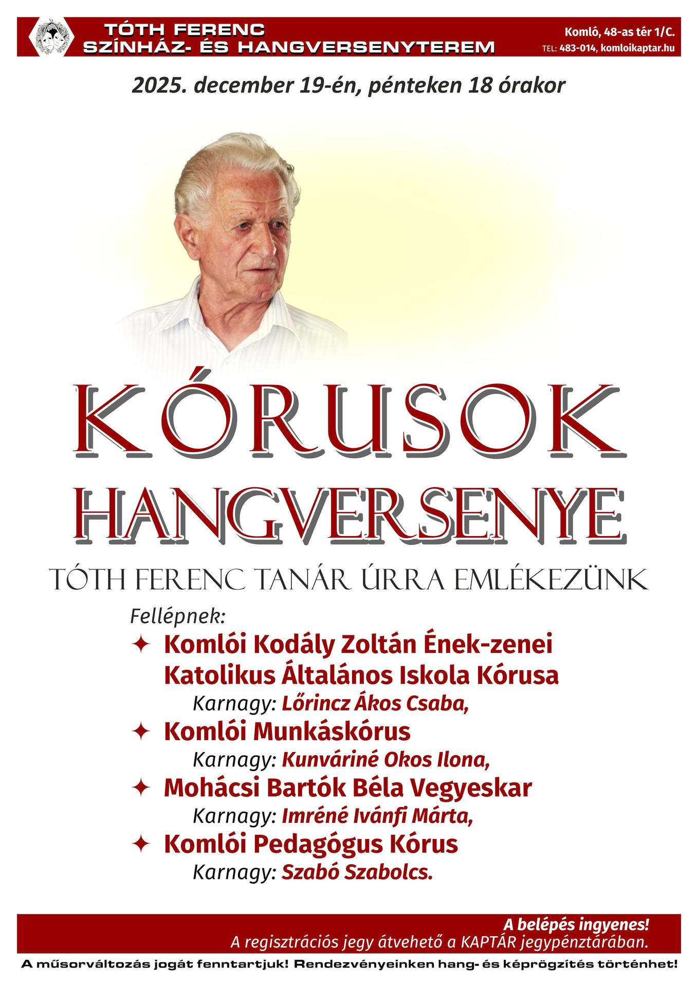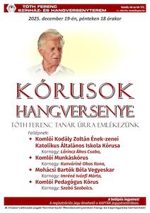 Friday, December 19, 2025, at 18:00, Komló Concert of Choirs - in memory of teacher Ferenc Tóth Friday, December 19, 2025, at 18:00 Featuring: Admission is free! Registration tickets can be picked up at the KAPTÁR ticket office. |