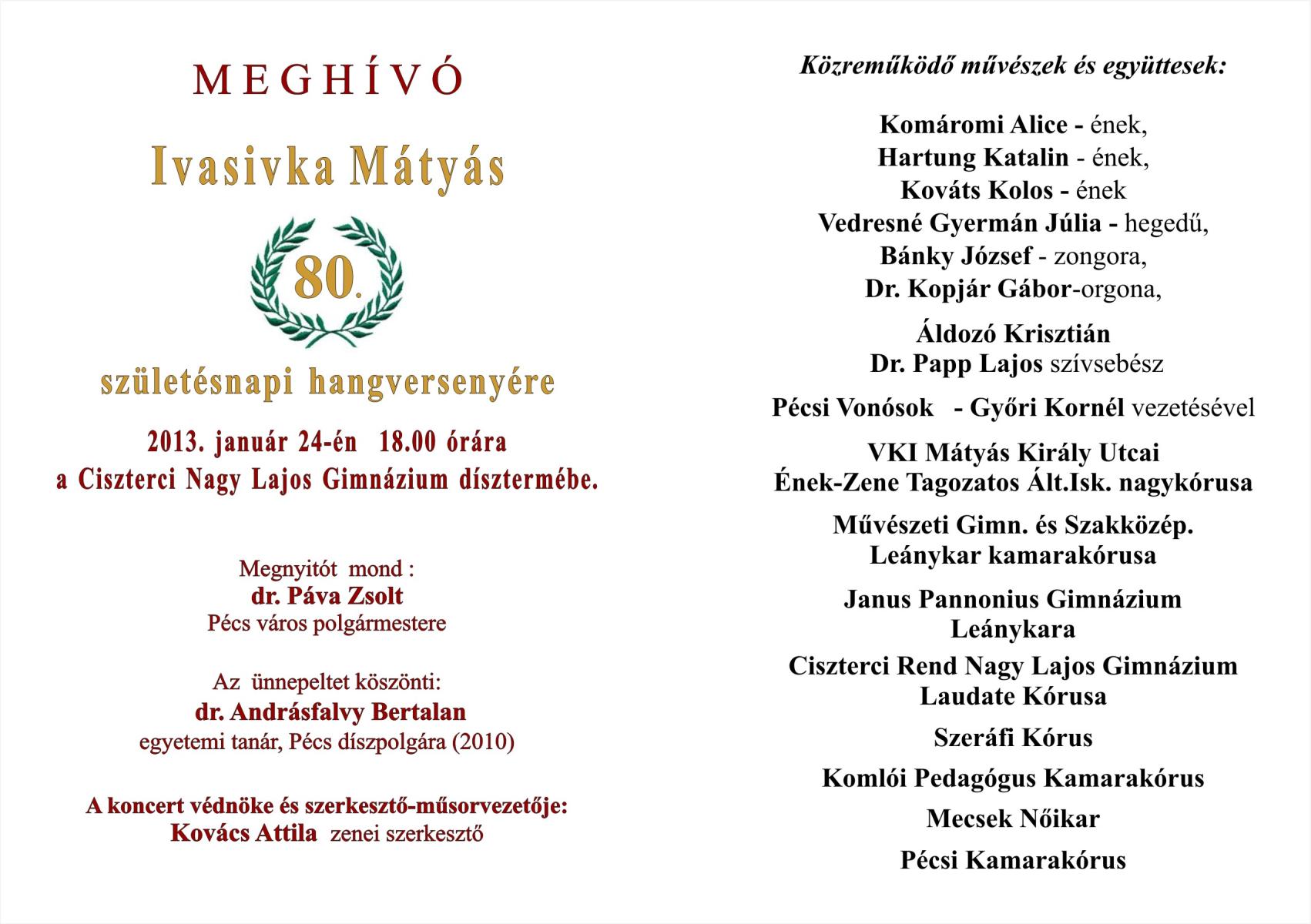 2013. január 24-én, csütörtökön, 18:00-kor Pécsett több előadóval közös jubileumi koncerten énekeltünk a 80 esztendős Ivasivka Mátyás tanár-karnagy úr tiszteletére a Ciszterci Nagy Lajos Gimnázium dísztermében (Széchenyi tér 11.). - Cikk a KÓTA weboldalán: - Beszélgetés Ivasivka Mátyással (parlando.hu): - A koncert képekben: