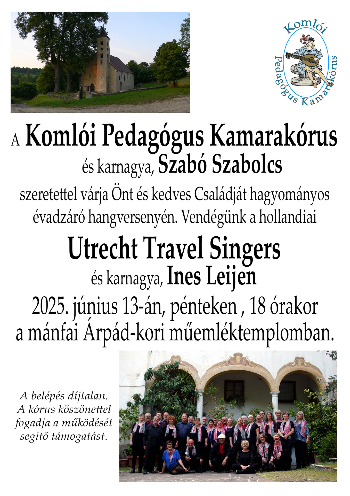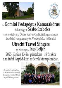 A Komlói Pedagógus Kamarakórus (karnagya: Szabó Szabolcs) és a hollandiai Utrecht Travel Singers (karnagya: Ines Leijen) közös koncertje kórusunk hagyományos évadzáró hangversenyén.